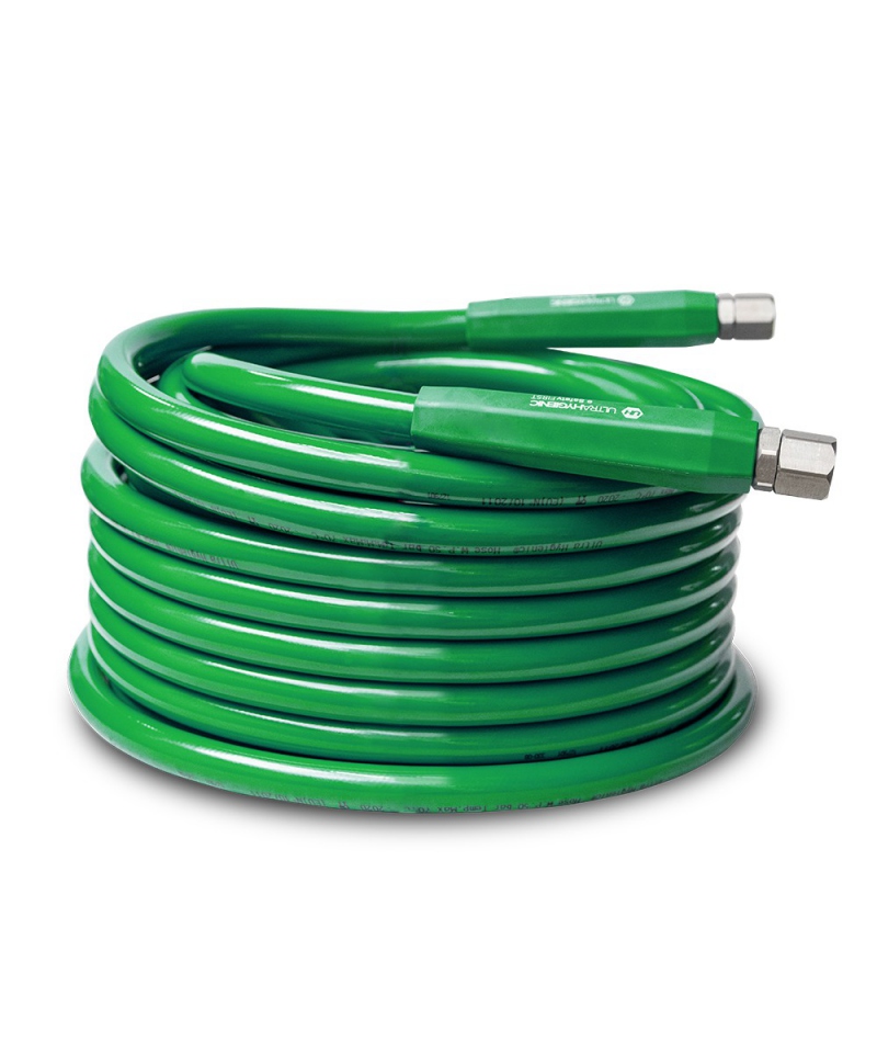 ULTRA HYGIENIC-Schlauch für den Lebensmittelbereich. Europäisch zugelassen. Ideal für zentrale Waschanlagen sowie für Leitungswasser. Widerstandsfähig bis 70° Grad und 50bar. Der Schlauch hat eine doppelte Textilverstärkung, die ihm ein sogenanntes "Memory" verleiht. Er besteht aus 6 speziellen Kunststoffschichten, die gegen alkalische und saure Umgebungen beständig sind. Die Außenfläche ist völlig glatt, nimmt keinen Schmutz auf und ist resistent gegen tierische und pflanzliche Fette.