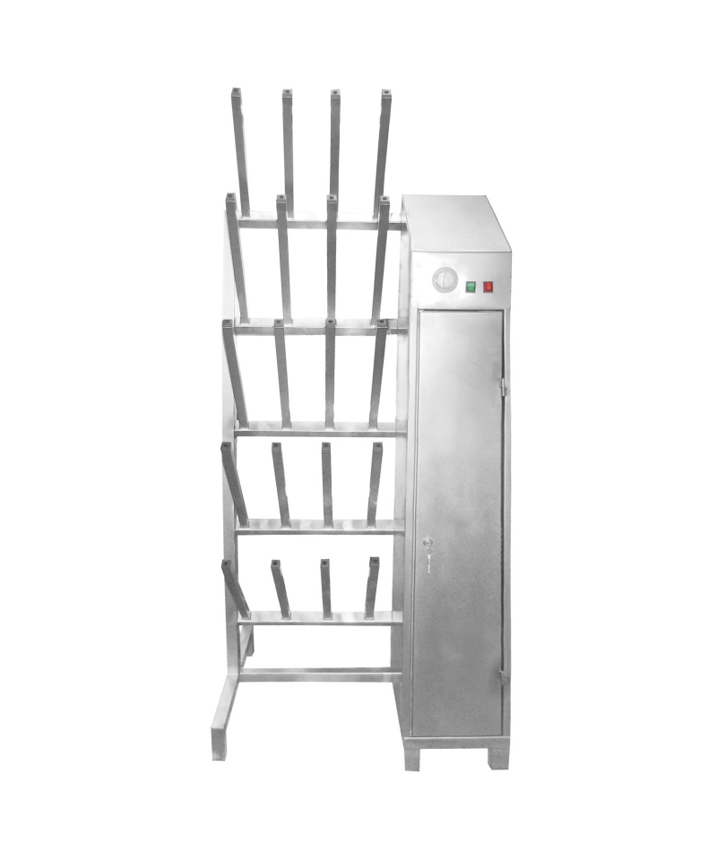 Der industrielle Schuhtrockner ist aus robustem Edelstahl gefertigt. Optional besteht die Möglichkeit, mit ozonhaltiger Luft zu trocknen, die eine keimtötende Wirkung hat.