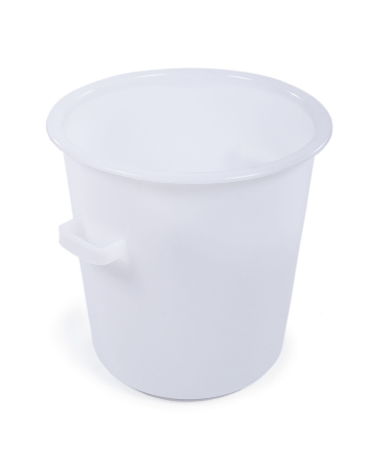 Der runde Kunststoffbehälter mit Griffen besteht aus lebensmittelechtem Polyethylen, das für Langlebigkeit und Festigkeit sorgt. Er ist einfach zu handhaben, leicht zu reinigen und ideal für die Lagerung und Zubereitung von Lebensmitteln.