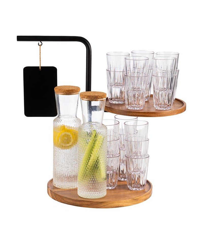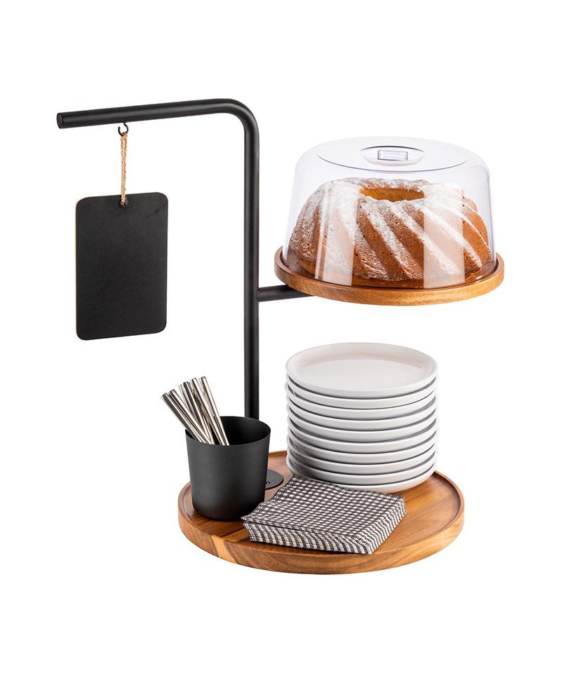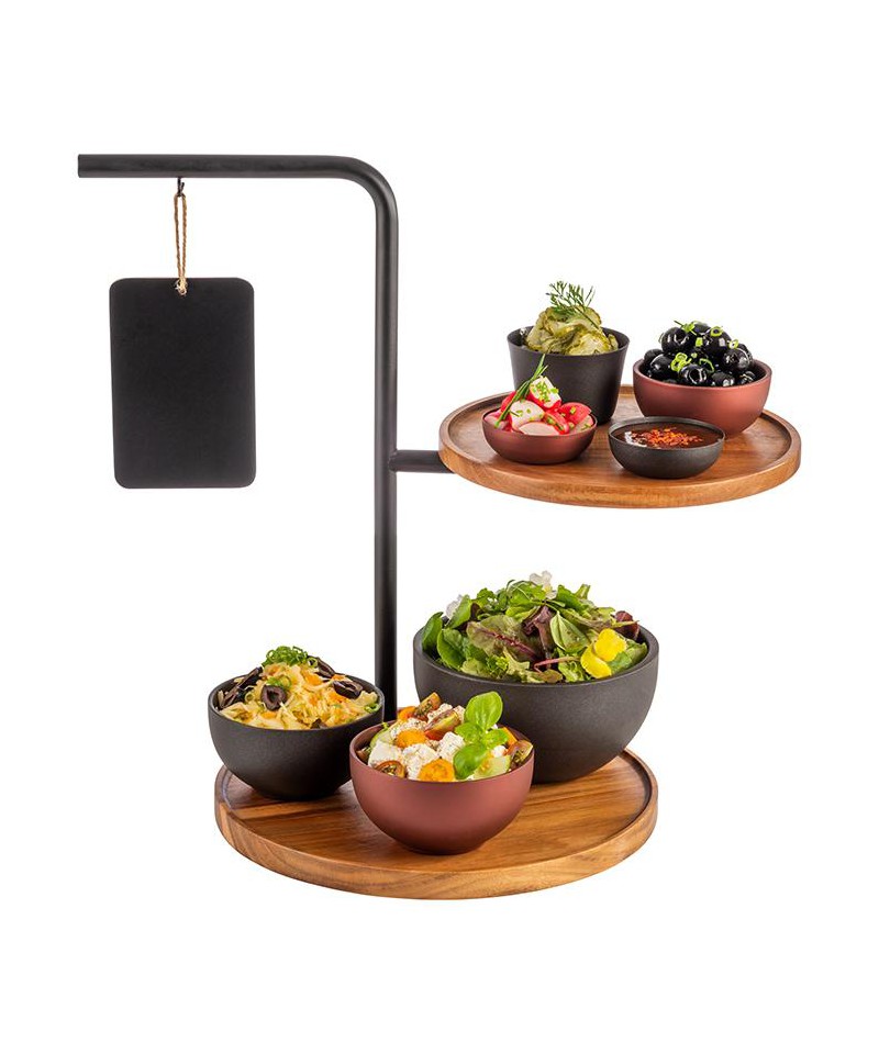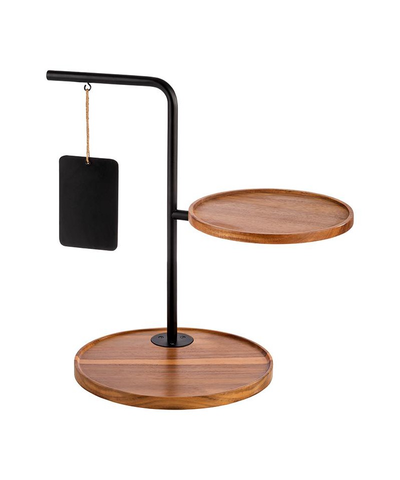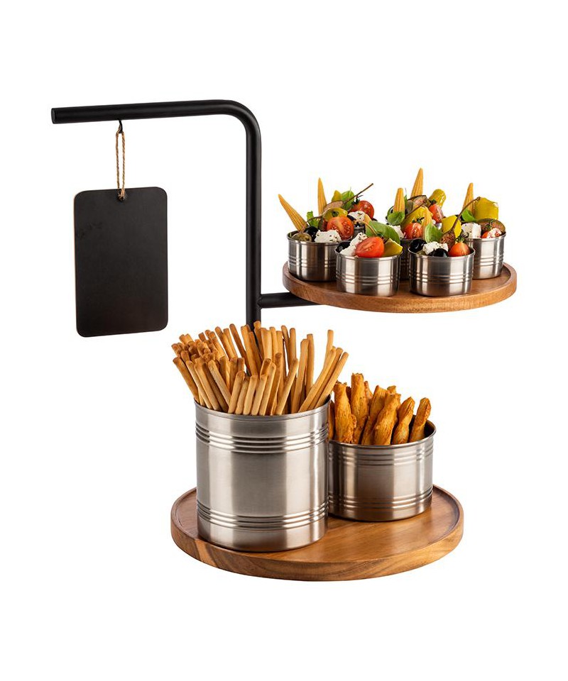 Hergestellt aus Metall und Holz. Die Etagere ist für die Präsentation von Speisen geeignet, sie erhöht nicht nur den ästhetischen Wert - sie regt auch den Appetit an. Das Produkt wird an vielen Orten Verwendung finden, wie z.B. in Hotels und Restaurants. Es kann verwendet werden, um eine Vielzahl von Gerichten zu servieren oder ein Frühstücksbuffet für die Verbraucher vorzubereiten. Die Platte kann auch zu Hause verwendet werden - ideal für das Servieren von Erfrischungen an Gäste. Mit seinem Aussehen zieht er die Gäste an, ganz gleich, wo er verwendet wird.