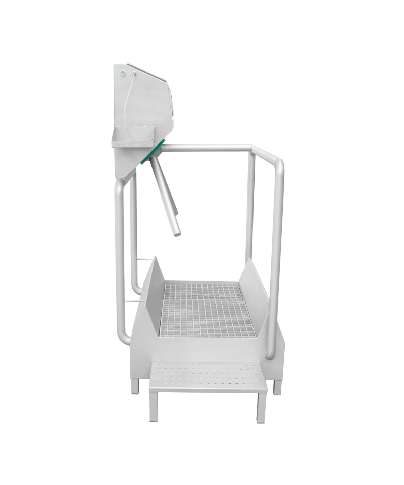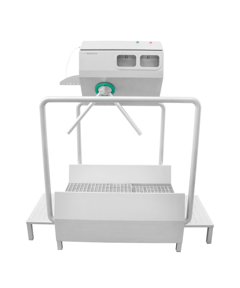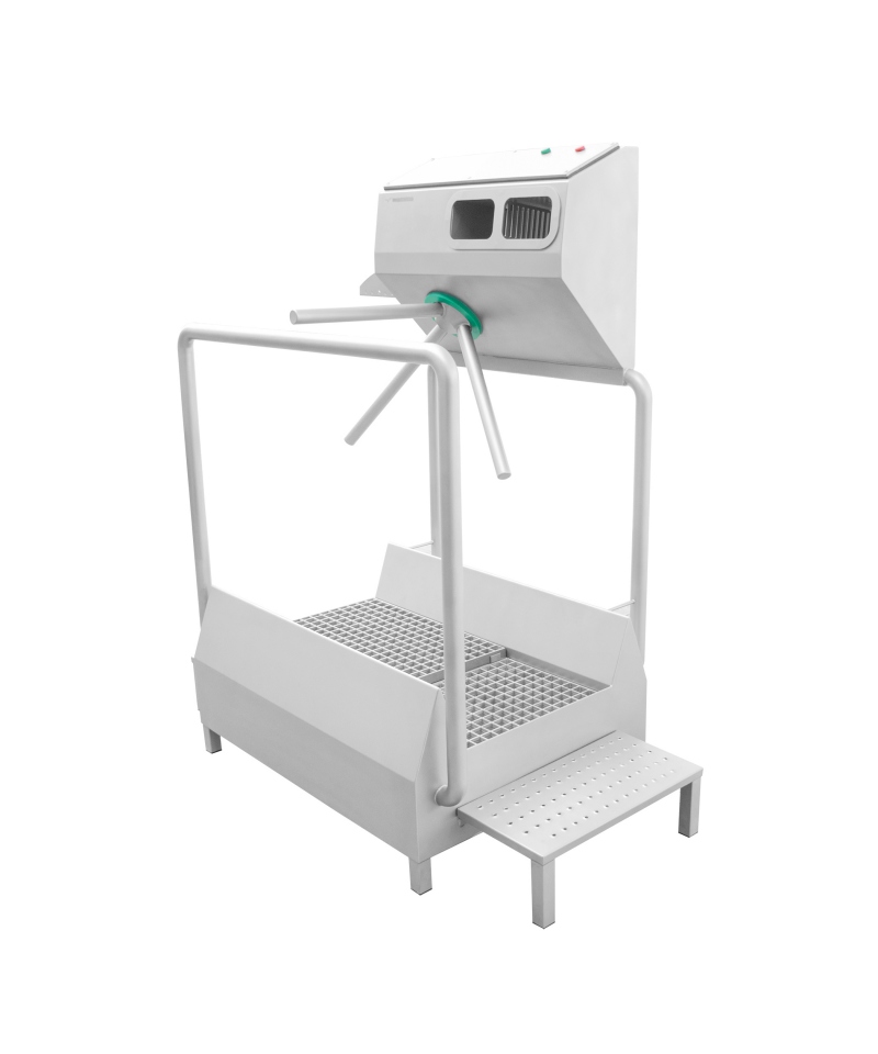 Die Station besteht aus zwei Komponenten - einer Kammer zur Händedesinfektion und einer Kammer zum Waschen der Schuhsohlen. Der Sprühstrahl des Desinfektionsmittels wird berührungslos mit Hilfe von Fotozellen aktiviert, was ein Höchstmaß an Hygiene ermöglicht. Außerdem lässt ein Drehkreuz den Durchgang erst zu, nachdem die erforderlichen Arbeiten durchgeführt wurden, so dass ein versehentliches Betreten des Hygienebereichs verhindert wird.