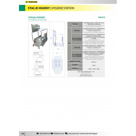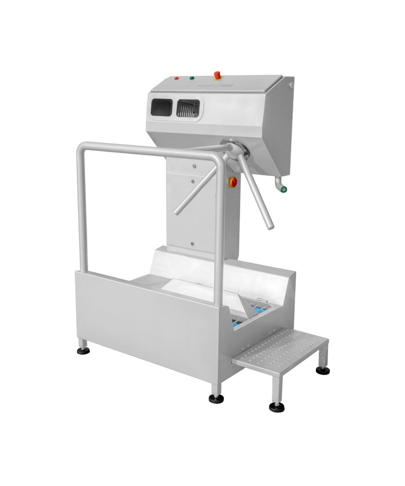 Führt zwei Tätigkeiten gleichzeitig aus. Sie desinfiziert die Hände und wäscht die Schuhsohlen des Arbeiters. Das Drehkreuz wird erst aktiviert, nachdem beide Hände desinfiziert wurden. Ein Fotozellensensor aktiviert die Sprühdüsen nur, wenn beide Hände in die Desinfektionskammern im oberen Teil der Schleuse eingeführt werden. Die Hygieneschleuse verfügt über ein Lichtsignal (rot und grün), das uns anzeigt, wann wir zur nächsten Zone weitergehen können. Die Länge der Bürsten auf der Plattform beträgt 70 cm.