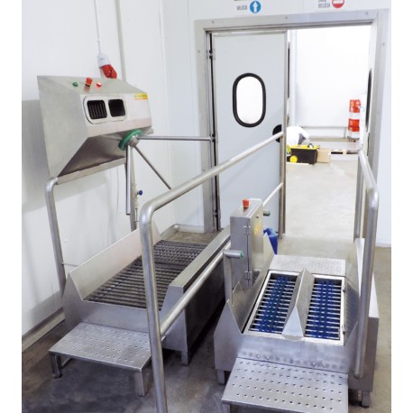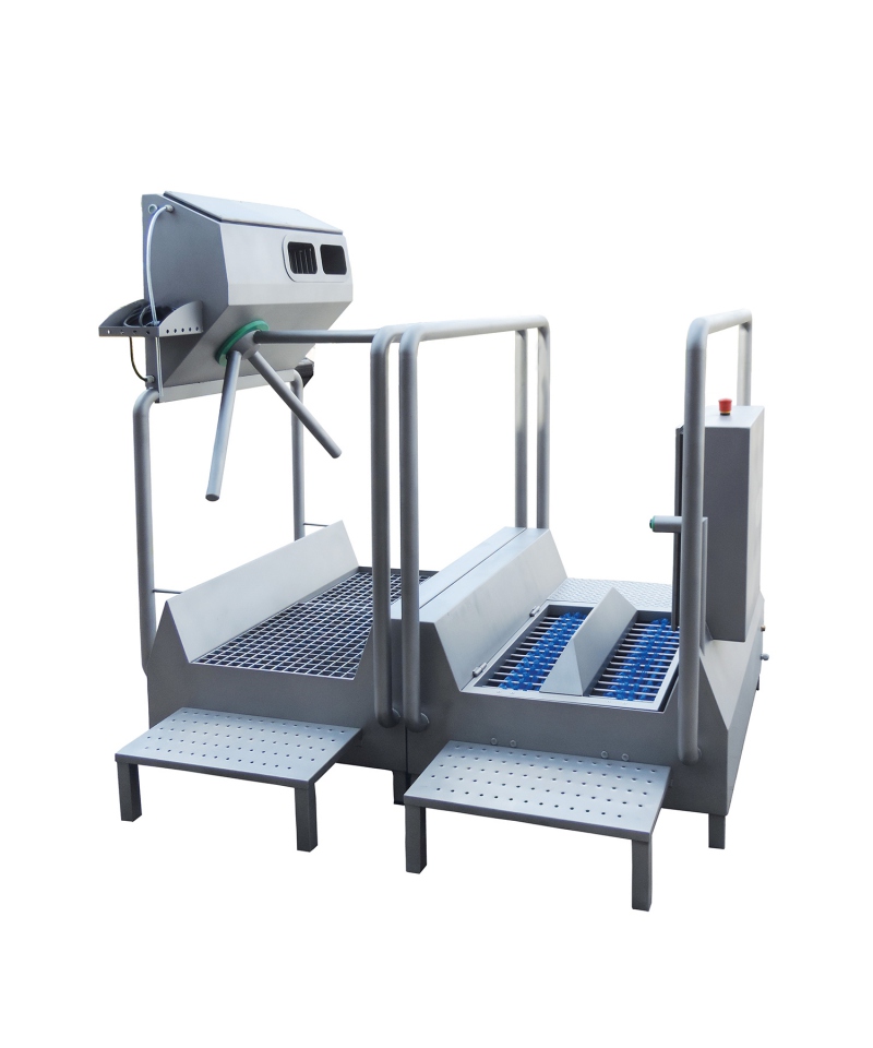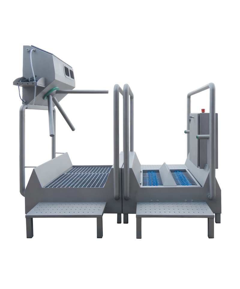 Zweiseitige Hygienestation mit Hand- und Sohlendesinfektion auf der einen und Sohlenreinigung auf der anderen Seite. Vollständig aus Edelstahl gefertigt. Beim Eintritt in die Produktion wird das Drehkreuz erst freigegeben, wenn beide Hände gleichzeitig desinfiziert sind. Beim Verlassen der Produktion erfolgt nur eine Schuhwäsche.