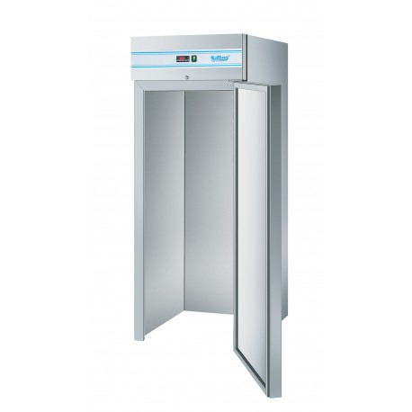 Einfahrbares Gefrierfach GN 2/1 mit Zwangsumluft, automatischer Abtauung und Heißgaskondensatverdunstung, regelbar mit Digitalanzeige. Zentrale Kühlung mit Expansionsventil und Tauwasserablauf. Einheit in Monoblockform auf der Oberseite des Gerätes.