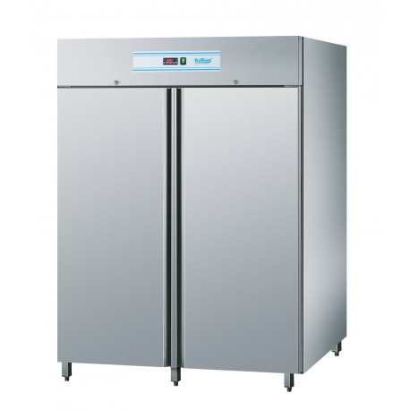 2/1 GN 2-türiges Umluft-Gefrierfach mit automatischer Abtauung und Heißgas-Tauwasserverdunstung, regelbar mit Digitalanzeige. Zentrale Kühlung mit Tauwasserablauf. Hygienischer Innenraum mit abgerundeten Kanten und geprägtem Boden. Verdampfer außerhalb des Kühlfachs. Monoblock-Kühler auf der Oberseite des Geräts.