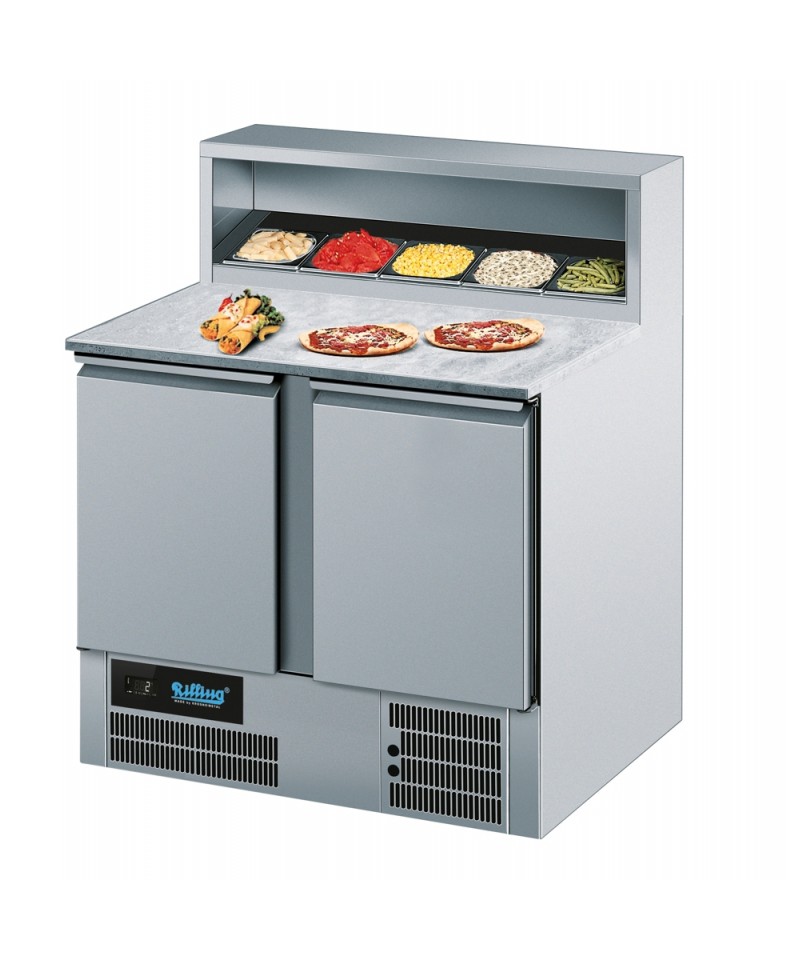 2-türiger Pizzatisch mit Granitplatte, Edelstahlanbau und Ausschnitt für GN-Behälter, Dämpfer in der Rückwand eingeschäumt, Zwangsumluft, automatische Abtauung und Tauwasserverdunstung, elektronische Steuerung. Anschlussfertig. Ohne GN-Behälter.