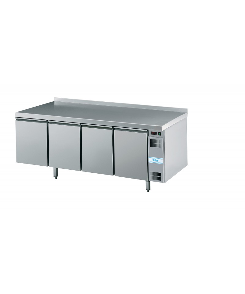 4-türiger Kühltisch für GN 1/1, Arbeitsplatte mit Hinterkante h=50 mm (Typ C), Verdampfer in der Rückwand eingeschäumt, leistungsstarkes Umluftsystem, automatische Abtauung und Tauwasserverdunstung mit Heißgas, elektronische Steuerung, Hygienic Design, anschlussfertig.