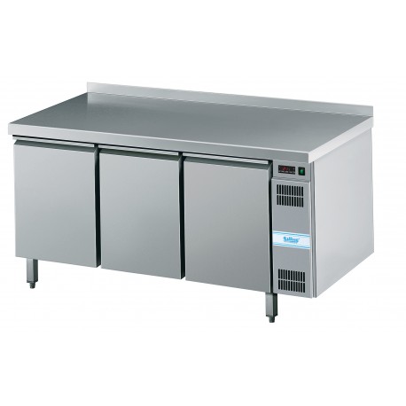 3-türiger Kühltisch geeignet für Backbleche EN 400x600 mm EN4060, Arbeitsplatte mit hinterem Rand h=50 mm (Typ C), Verdampfer in der Rückwand eingeschäumt, leistungsstarkes Umluftsystem, automatische Abtauung und Tauwasserverdunstung mit Heißgas, elektronische Steuerung, Hygienic Design, anschlussfertig.