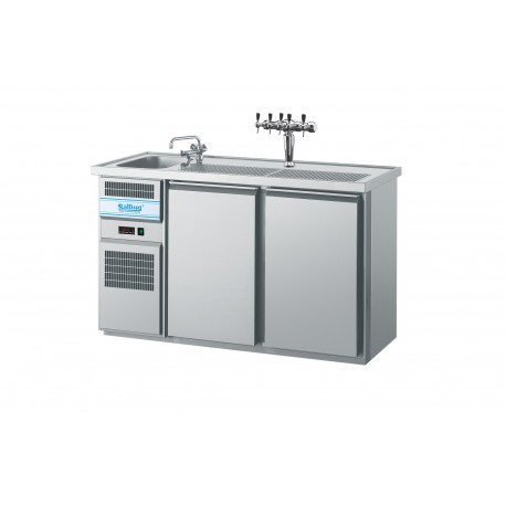 2 x Flügeltüren und 1 Spülenfach 300x500x300mm. Kühle Luftzirkulation und elektronische Steuerung. Verdampfer mit Edelstahlblech verkleidet. Kühlkörper geschäumt mit PUR unter Druck. Ausführung: Innenraum, Front und Deckel in Edelstahl. Arbeitsplatte mit Tropfgitter und Ablauf. Ohne Mischer und Ausgießvorrichtung.