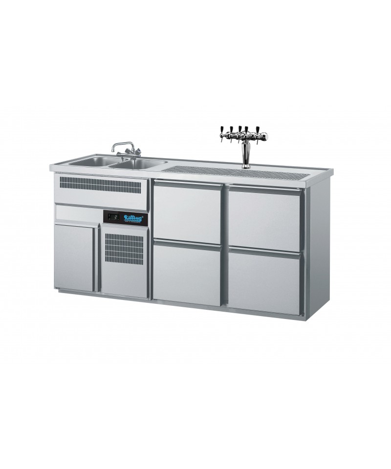 4 Schubladen mit einer Nutzhöhe von je 345mm und 2 Spülbeckenfächer 300x500x300mm. Kühle Luftzirkulation und elektronische Regelung. Verdampfer mit Edelstahlblech verkleidet. Kühlkörper geschäumt mit PUR unter Druck. Ausführung: Innenraum, Front und Deckel aus Edelstahl. Arbeitsplatte mit Tropfgitter und Ablauf. Ohne Mischer und Ausgießvorrichtung.