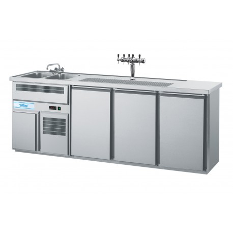 3 x Flügeltüren und 2 Spülkammern 300x500x300mm. Kühle Luftzirkulation und elektronische Steuerung. Verdampfer ummantelt mit Edelstahl-Blech. Kühlkörper geschäumt mit PUR unter Druck. Innenraum, Front und Deckel aus Edelstahl. Arbeitsplatte mit Tropfgitter und Ablauf. Ohne Mischbatterie und Düse.