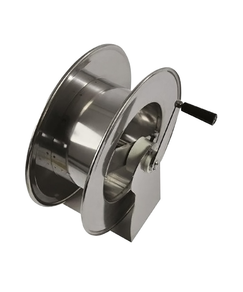 Ein manuell aufrollbarer Schlauchaufroller aus Edelstahl, der für 3/4-Zoll-Schläuche ausgelegt ist. Die robuste Konstruktion des Aufrollers und der verstärkte Befestigungsfuß garantieren Langlebigkeit und Zuverlässigkeit.
