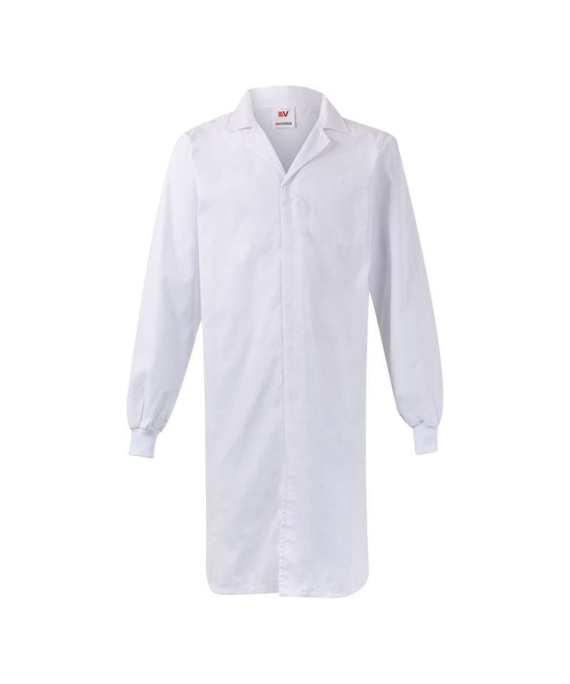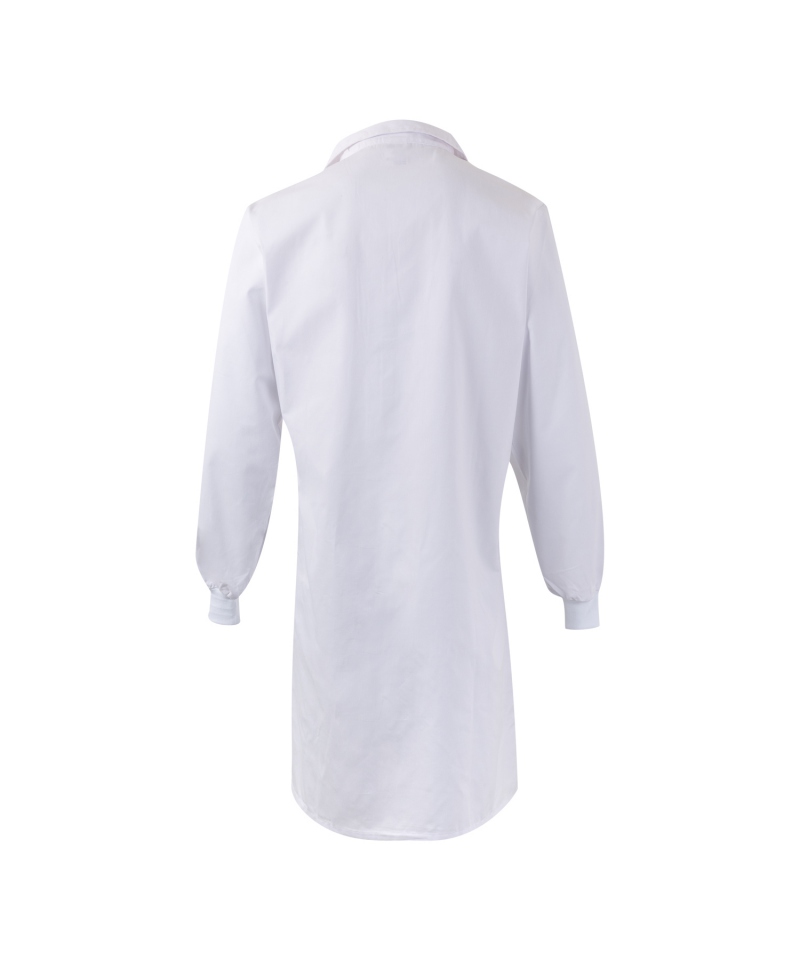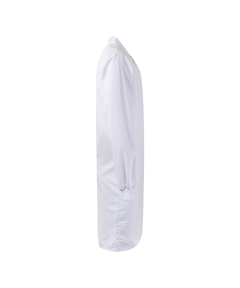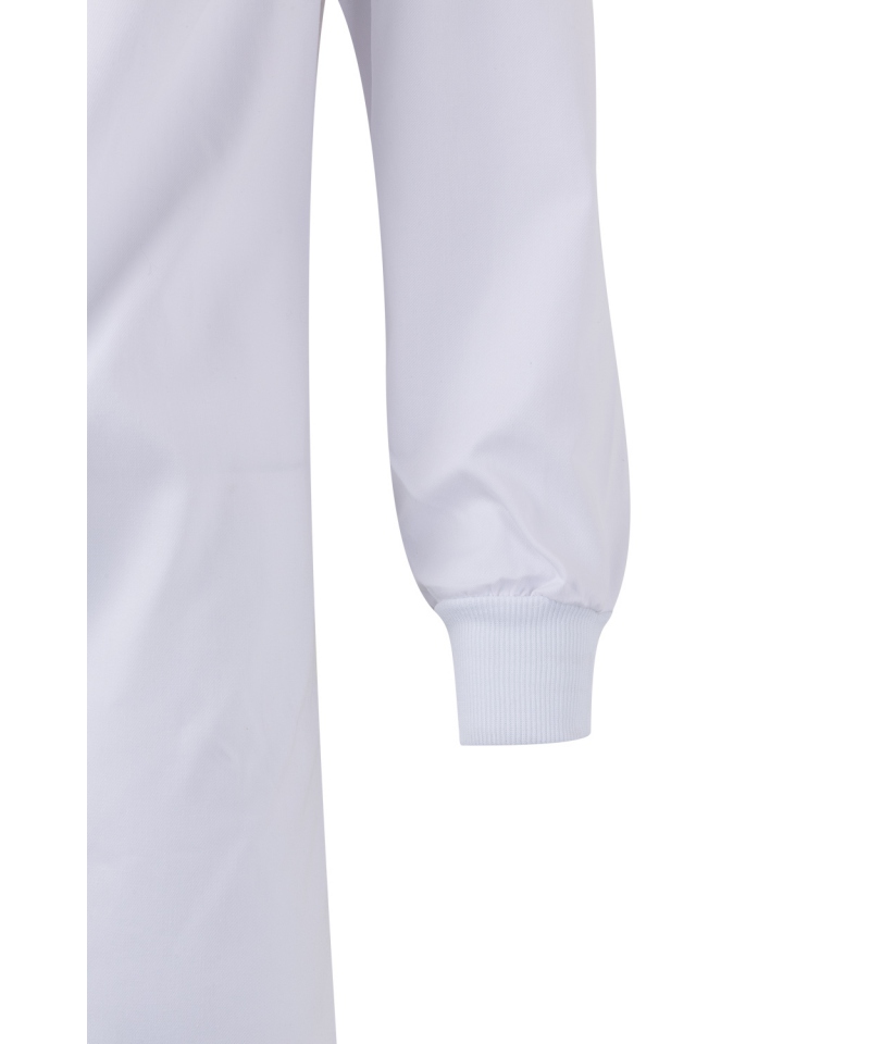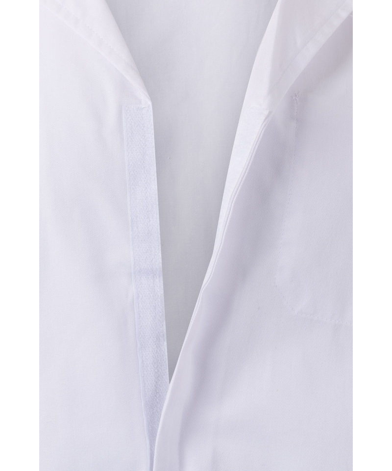 Weiße Laborschürze mit Klettverschluss - ideal für die Lebensmittelindustrie. Diese Unisex-Schürze ohne Taschen und Reißverschlüsse ist unverzichtbar für Mitarbeiter, die Wert auf Hygiene und Komfort bei der Arbeit legen. Die robuste Konstruktion und das besondere Design garantieren Langlebigkeit und Effizienz bei der Arbeit in rauen Industrie- und Gastronomieumgebungen.