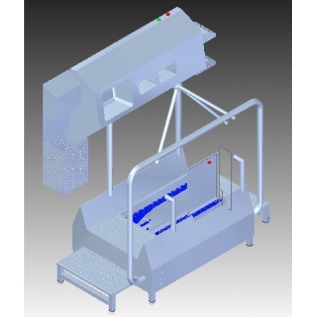 Eine Hygienestation für Produktionsarbeiter. Ermöglicht das Waschen und Desinfizieren der Hände und das Waschen der Schuhsohlen. Vollständig aus rostfreiem Stahl gefertigt. Erstes Waschen der Hände mit Wasser und Seife. Dann Zwangdesinfektion beider Hände gleichzeitig, wodurch das Drehkreuz freigegeben wird und der Durchgang zum Produktionsbereich möglich ist. Die Auslösung des Desinfektionssprays erfolgt berührungslos über Fotozellen.