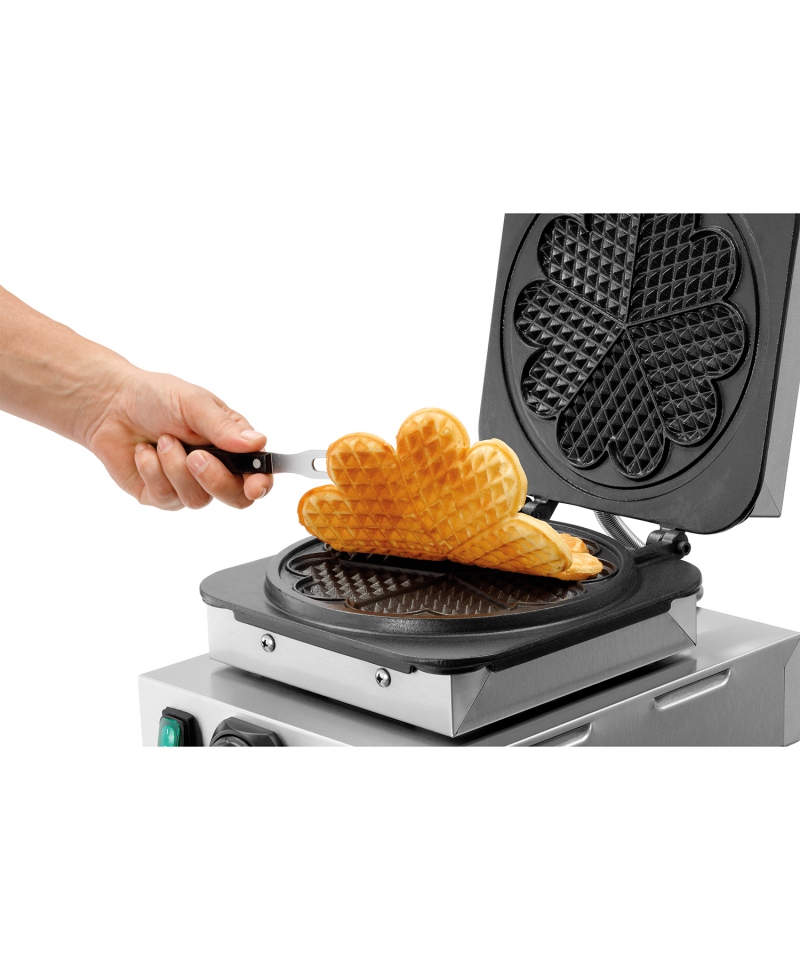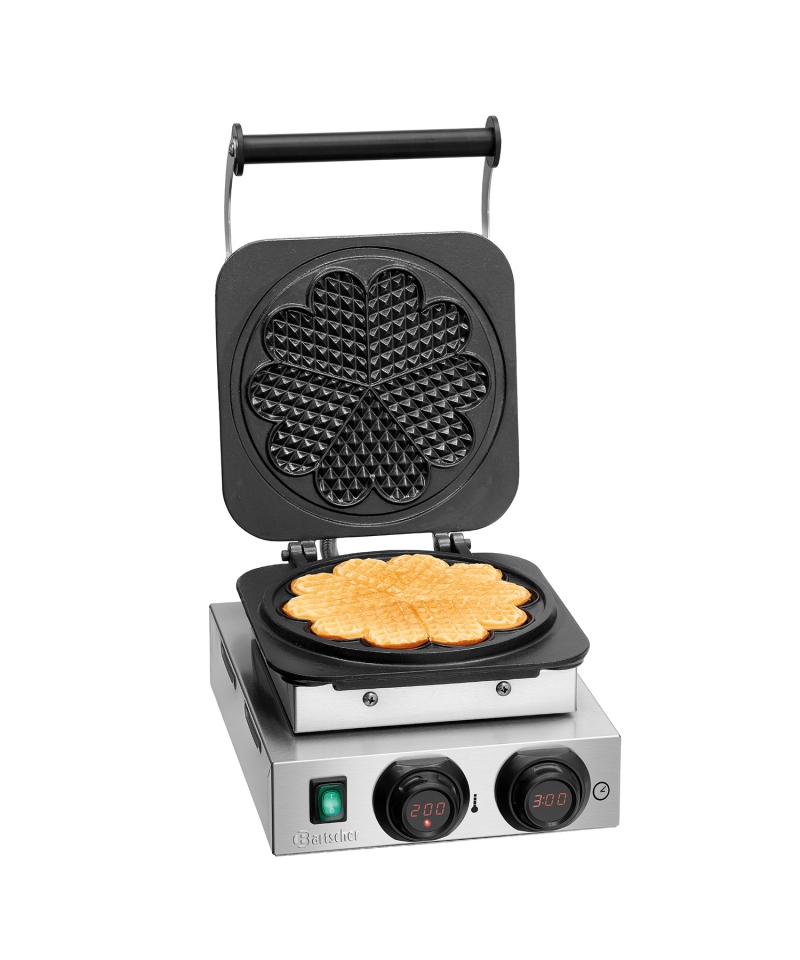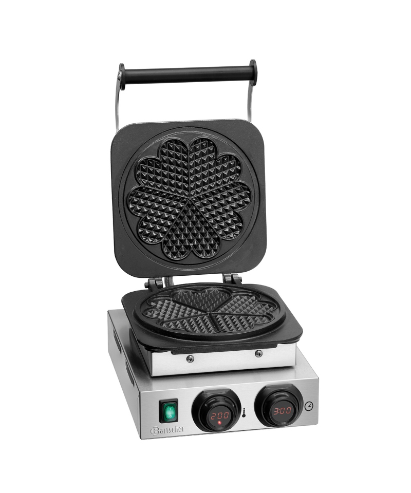 Das Waffeleisen MDI 1HW211 von Bartscher ist ein einzigartiges Gerät für die Zubereitung herzförmiger Waffeln. Es ist aus robustem Edelstahl gefertigt, der für Langlebigkeit und ein ästhetisch ansprechendes Aussehen sorgt. Seine emaillierten Gusseisenplatten mit einem Durchmesser von 210 mm und einer Höhe von 16 mm garantieren ein hervorragendes Backergebnis. Die Kochplatten sind fest montiert, was für Stabilität bei der Zubereitung von Speisen sorgt. Die Temperatur wird elektronisch mit einer Genauigkeit von 1°C geregelt, so dass das Gerät an verschiedene Teigsorten angepasst werden kann.