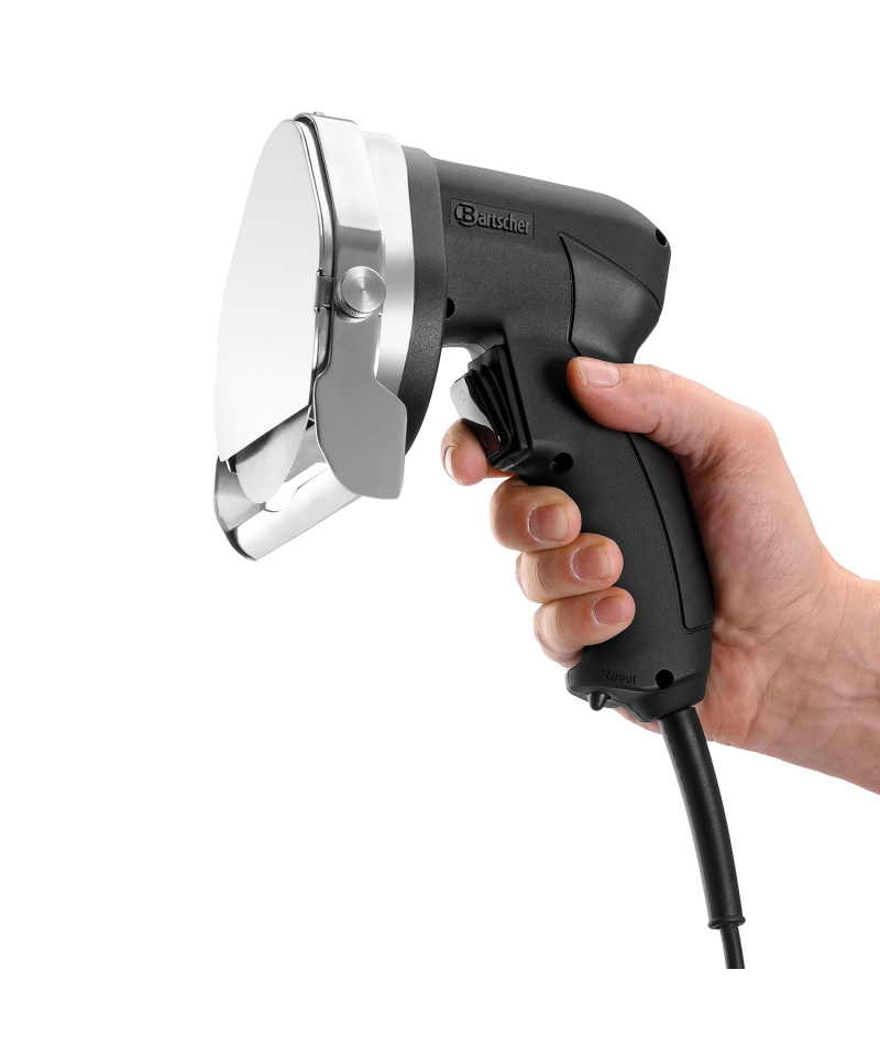 Das elektrische Dönermesser von Bartscher ist ein modernes Gerät zum Schneiden von Dönern. Es handelt sich um eine elektronische Version des Messers aus rostfreiem Stahl mit einer glatten Klinge von 100 mm Durchmesser. Mit diesem Messer können Sie die Schnittstärke von 0 bis 6 mm einstellen, um sie an unterschiedliche Bedürfnisse anzupassen. Die Klinge ist durch eine Schutzvorrichtung geschützt und das Messer erreicht eine Höchstgeschwindigkeit von 2560 U/min. Außerdem ist es mit einem Überlastungsschutz ausgestattet und hat die Schutzklasse 2.