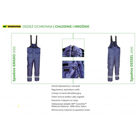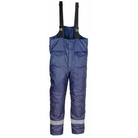 Dessel-Hosenbekleidung, die mit einer Technologie hergestellt wird, die ein hohes Maß an Schutz gegen niedrige Temperaturen gemäß EN 342:2004 (Kälteschutzkleidung) gewährleistet. Zertifizierte Bekleidung für die Arbeit in Kühlhäusern und Tiefkühlräumen in der Lebensmittelindustrie.