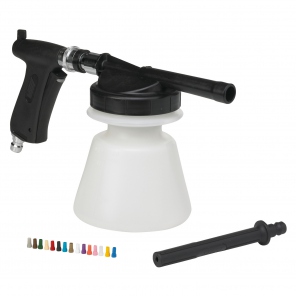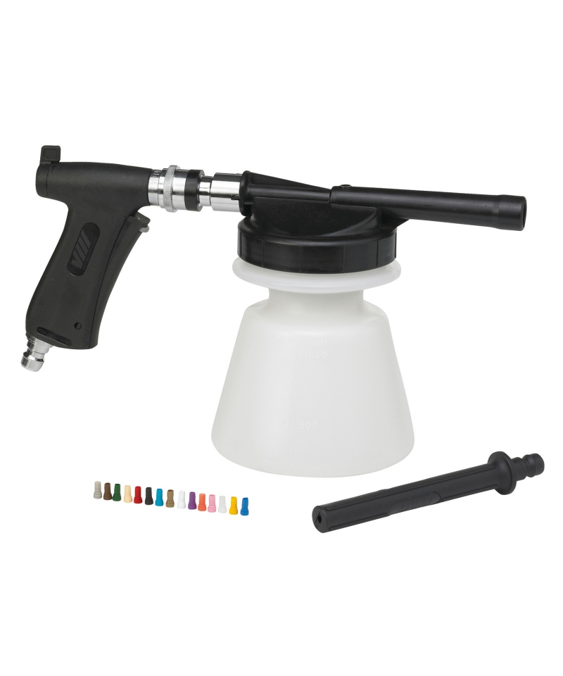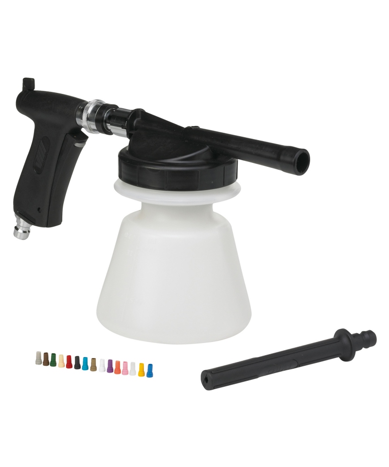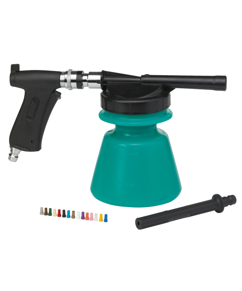 Er hält einem Druck von 6 bar stand, fasst 1,4 Liter Chemie und verfügt über einen praktischen Abzugsgriff für eine schnellere Reinigung. Sie ist in 5 Farben erhältlich und verfügt über einen Satz von 15 farbcodierten Düsen für unterschiedliche Konzentrationen von Chemikalien. Niemals Chemikalien direkt in die Schaumpistole geben.