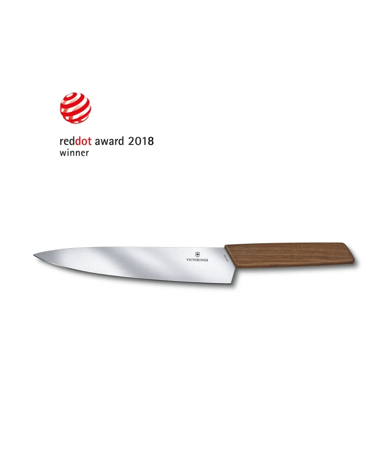 Doch damit nicht genug: Der ergonomische Griff aus europäischem Walnussholz sieht nicht nur schön aus, sondern liegt auch perfekt in der Hand. Die Holzmaserung verleiht ihm einen einzigartigen Charakter und die ausgewogene, geometrische Form des Griffs sorgt für einen stabilen und sicheren Halt und erleichtert die Arbeit. Das Swiss Modern Portioniermesser gehört zu den Küchenwerkzeugen, die das Auge erfreuen und über Jahre hinweg dienen. Es ist ideal zum Schneiden von Fleisch, Aufschnitt, Brot, Obst und Gemüse. Es ist nicht nur ein Küchenwerkzeug, sondern auch eine schöne Dekoration für jede Küche.