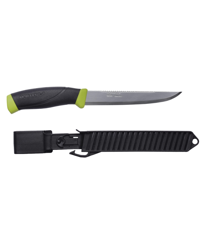Das Messer ist mit einem konturierten Griff ausgestattet, der einen sicheren und bequemen Halt bietet. Dadurch wird sichergestellt, dass das Werkzeug beim Arbeiten nicht verrutscht und keine Kälte ableitet, so dass es das ganze Jahr über bequem zu benutzen ist. Das Messer wird mit einer Polymerscheide mit Verriegelungsmechanismus geliefert, so dass das Messer sicher am Gürtel getragen werden kann. Die Scheide verfügt außerdem über zwei Befestigungsarten: einen Clip und eine Gürtelschlaufe.