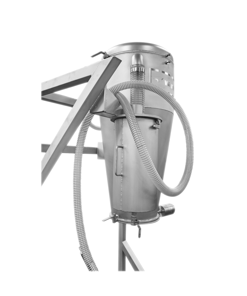 Der Tornado ist aus hochwertigen Materialien gefertigt. Der Tank, der Vakuumerzeuger und das Stativ sind aus säurebeständigem Stahl gefertigt, der eine lange Lebensdauer und Korrosionsbeständigkeit gewährleistet. Der Saugschlauch aus Polyurethan ist für den Transport von Lebensmitteln geeignet und entspricht den Hygiene- und Sicherheitsanforderungen.