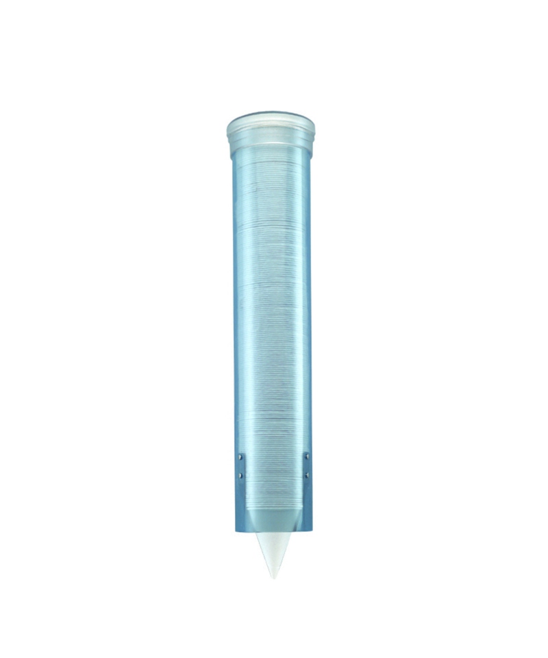 Automatischer Spender von kleinen Trinkbechern aus blauem, transparentem Kunststoff, zur vertikalen Montage an einer Wand oder einem Geräteschrank.