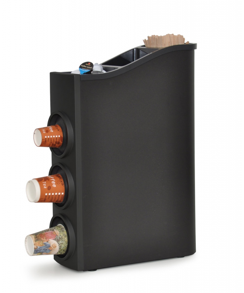 Der Becherspender ZD40BK ist eine robuste und stabile Box, die komplett aus elegantem schwarzem Metall besteht. Er wird mit einem Kunststoffdeckel und drei verschiedenen Hüllen für die Becherausgabe geliefert. Darüber hinaus verfügt der Spender über einen herausnehmbaren Organizer für Portionspackungen. Dank seines extrem schlanken Designs kann dieser Spender optimal platzsparend aufgestellt werden.
