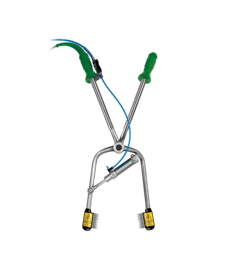 Die pneumatischen Arme der XP-Serie wurden speziell für die effektive und sichere Betäubung von Tieren wie Schweinen, Rindern, Schafen und Ziegen durch Anlegen eines elektrischen Impulses mit Hilfe von am Kopf angebrachten Elektroden entwickelt. Die robuste Konstruktion aus hochwertigem Edelstahl garantiert Langlebigkeit und Zuverlässigkeit. Das einzigartige Kabel, das in den Griff integriert ist, ermöglicht eine komfortable Bedienung und die ergonomischen Gummigriffe bieten einen sicheren Halt. Die Arme sind so optimiert, dass sie sich vom Benutzer leicht manövrieren lassen, und die Effizienz des Stromflusses wird durch die scharfen Stahlelektroden an ihren Enden ermöglicht.