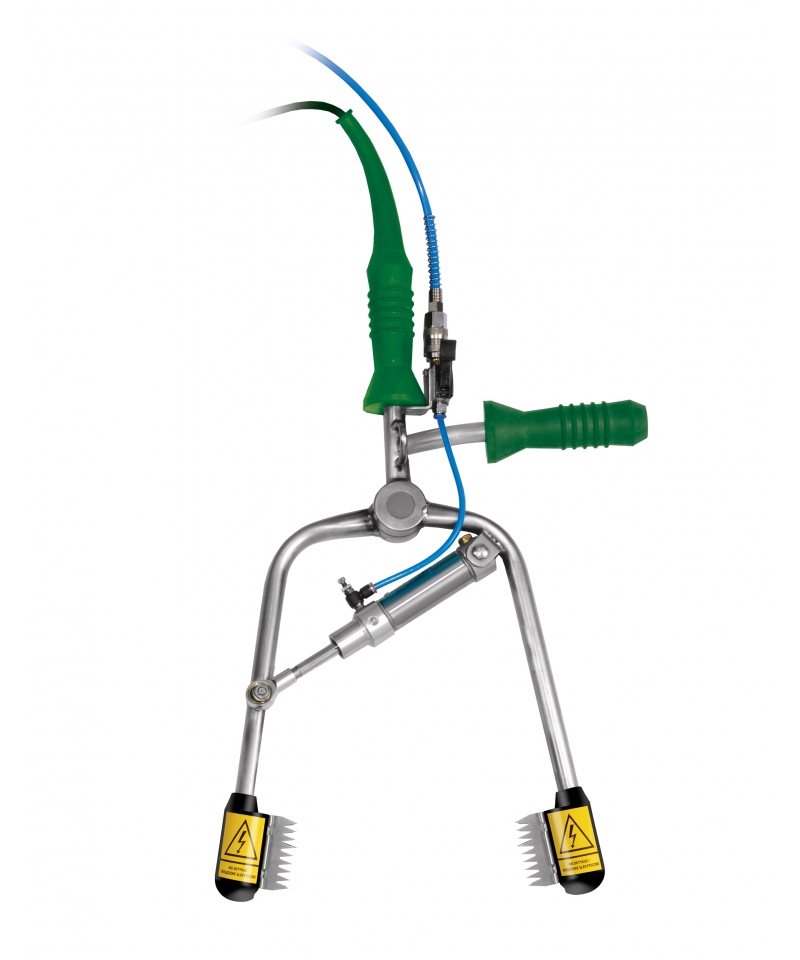 Der verwendete pneumatische Elektrodenklemmmechanismus erhöht die Effizienz des Geräts erheblich. Die konstante Druckkraft garantiert die Stabilität der Betäubungsparameter, was den Arbeitsaufwand des Bedieners erheblich reduziert. Sobald die Elektroden am Kopf des Tieres angebracht sind, betätigt der Benutzer die pneumatische Steuerung, die die Elektroden festzieht und den Betäubungsvorgang einleitet. Wenn die Steuerung losgelassen wird, kehren die Arme in ihre ursprüngliche Position zurück.