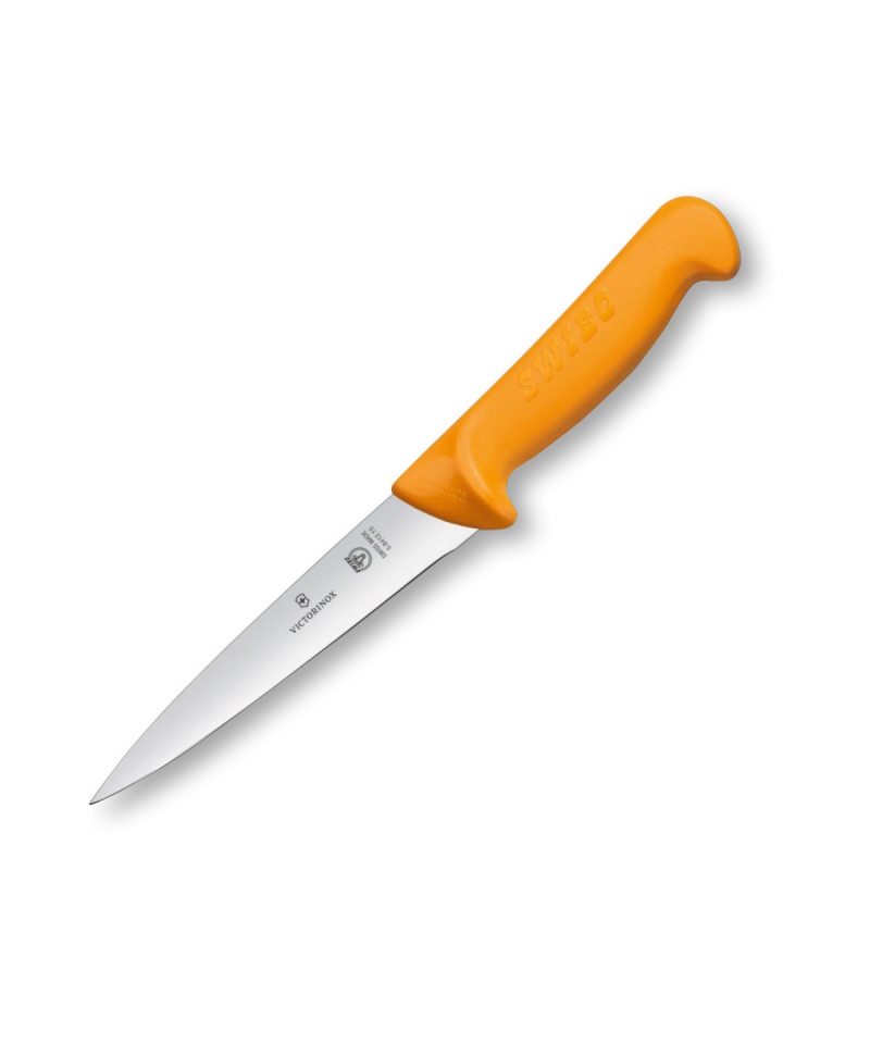 Schweizer Victorinox-Messer aus der Swibo-Serie, die für die Fleischindustrie, Schlachthöfe, Metzgereien sowie Metzgereien und Gastronomie bestimmt sind. Besonders geeignet zum Trennen von Fleisch vom Knochen (Ausbeinen). Ausgestattet mit einer Klinge aus rostfreiem Stahl von höchster Qualität. Das Modell 5.8412 hat eine gerade Klinge mit einer spitzen Spitze.