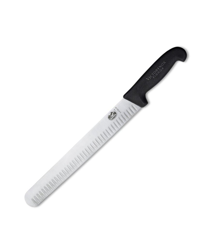 Ein professionelles Aufschnittmesser aus rostfreiem Edelstahl und einem Griff aus Polyamid. Das Messer hat eine abgerundete Klinge und Riffelungen, die verhindern, dass das geschnittene Fleisch oder Lachsfilet an der Oberfläche kleben bleibt.