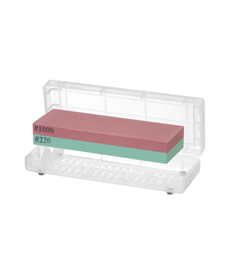 • Doppelseitiges Design mit Platten unterschiedlicher Körnung (220/1000) für eine vollständige Kontrolle über den Schärfvorgang.
