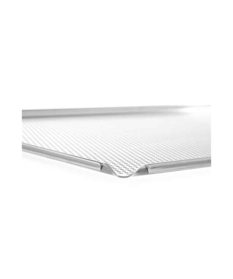 Die perforierte Oberfläche unterstützt eine optimale Luftzirkulation und sorgt für bessere Backergebnisse. Vier umlaufende Ränder verhindern das Auslaufen von Fett und Flüssigkeiten und erhöhen die Arbeitssicherheit sowie Sauberkeit. Das Blech ist für den Einsatz im Backofen geeignet und für den Kontakt mit Lebensmitteln zugelassen.