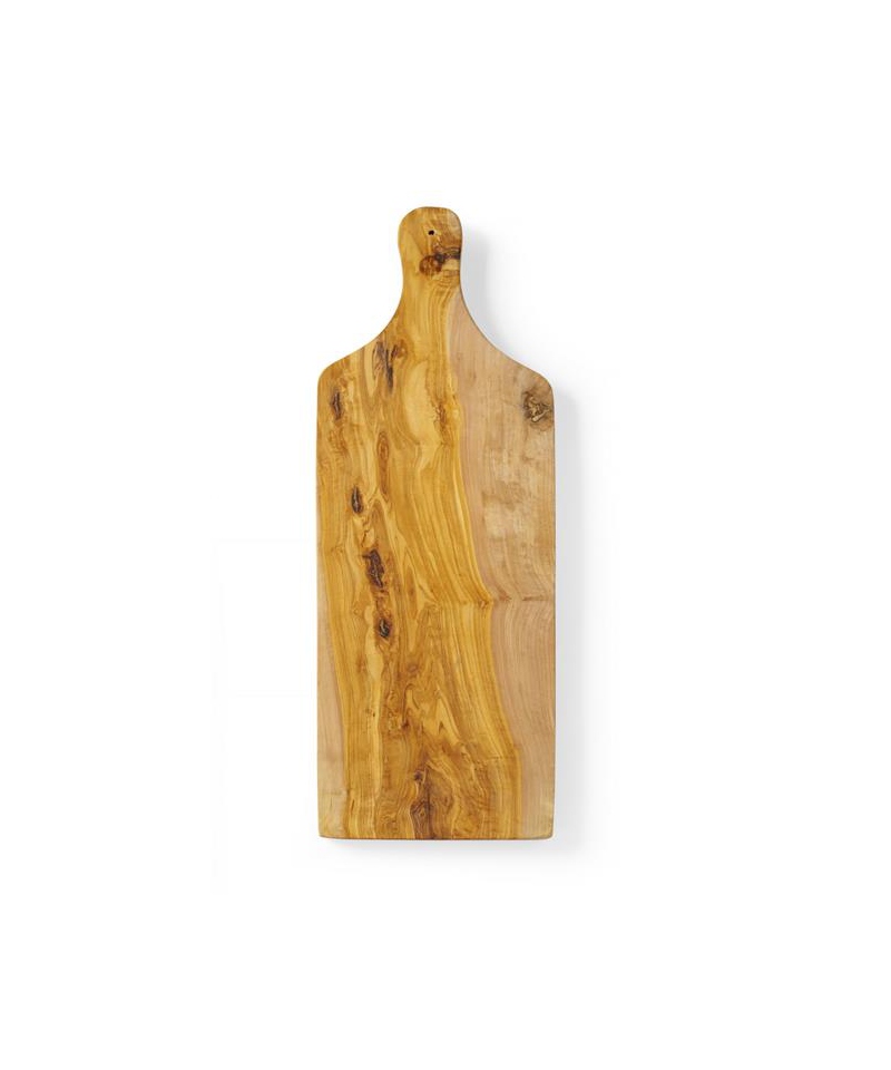 Olivenholz ist besonders langlebig und feuchtigkeitsbeständig. Der integrierte Griff erleichtert das Tragen und Servieren. Für den Kontakt mit Lebensmitteln geeignet, nicht spülmaschinenfest.