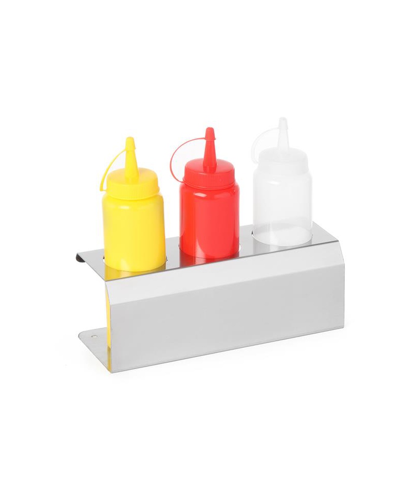 Der Ständer verfügt über 3 Öffnungen mit Ø 55 mm, passend für HENDI-Saucenspender. Die Bodenplatte mit Rand sorgt für zusätzliche Stabilität und verhindert ein Verrutschen der Spender. Ideal für Buffets, Ausgabetheken, Restaurants, Bars und Imbissbetriebe.