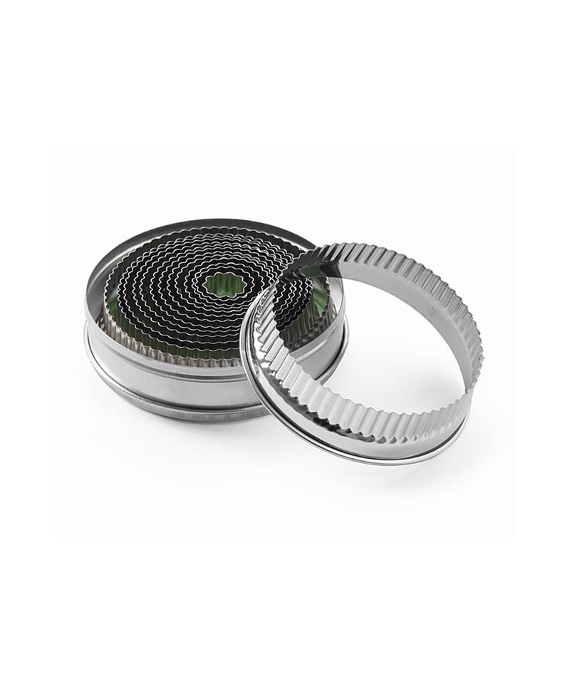 Das Ausstechform-Set 674413 umfasst 14 gezackte, runde Ausstecher, konzipiert für Konditoreien, Bäckereien und Dessert-Produktion. Die Ausstecher ermöglichen das präzise Ausstechen von Teigscheiben oder dekorativen Ringen aus Mürbeteig, Blätterteig oder süßen Snacks. Der gezackte Rand verleiht den ausgestochenen Formen ein dekoratives Finish, und das umfassende Set unterstützt effizientes Arbeiten bei größeren Serien.