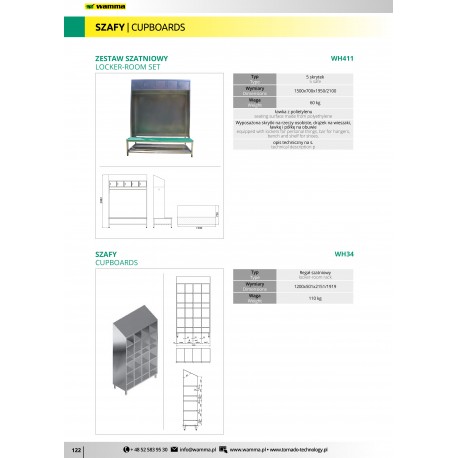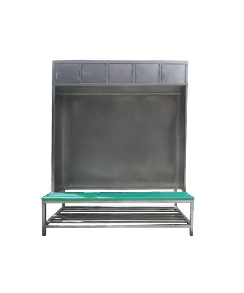 Sozialschrank aus rostfreiem Stahl, mit einer Sitzbank aus Polyethylen. Er verfügt über fünf Fächer zur Aufbewahrung von persönlichen Gegenständen der Mitarbeiter, die alle mit einem Euroschloss verschlossen werden können. Der Spind hat auch eine Schiene mit Kleiderbügeln, um Arbeitskleidung wie Schürzen oder Overalls aufzuhängen. Unter der Bank befindet sich ein Regal für Arbeitsschuhe, Gummistiefel oder Halbschuhe.