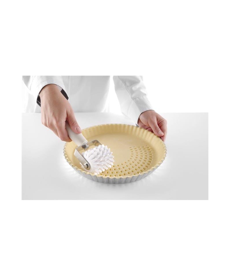 Die „Drehrolle zur Teiglochung – Walzenbreite 70 mm“ (Basisausführung) ist ein praktisches Werkzeug für Bäckereien und Konditoreien, entwickelt zum effizienten Einstechen oder Perforieren von Teig – z. B. bei der Herstellung von Tortenböden, Keksschnitten oder anderen Backwaren, die Belüftung oder gleichmäßige Hitzeverteilung benötigen. Herstellerangabe: Walzenbreite 70 mm, Maße 85×210 mm.