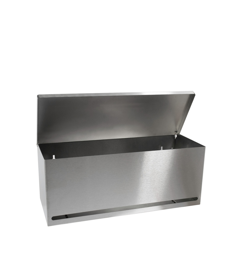 Spender aus Edelstahl 1.4301, wandmontiert, mit Deckel. Vorgesehen für Kunststoffschürzen oder Müllsäcke von der Rolle.