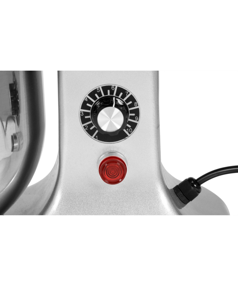 Das Gerät bietet eine stufenlose **Drehzahlregelung im Bereich von 0 bis 780 U/min**, was eine präzise Anpassung des Betriebsmodus an die Besonderheiten der zubereiteten Zutaten ermöglicht. Eine innovative Schutzvorrichtung verhindert das Starten des Mixers bei zu hohen Drehzahlen, was effektiv vor dem Verschütten des Schüsselinhaltes schützt und das Risiko einer Getriebeschädigung minimiert. Zusätzlich ist der Mixer zur Erhöhung der Sicherheit mit einem Not-Aus-Schalter ausgestattet, der den Betrieb beim Versuch, den Arbeitskopf anzuheben, automatisch unterbricht.