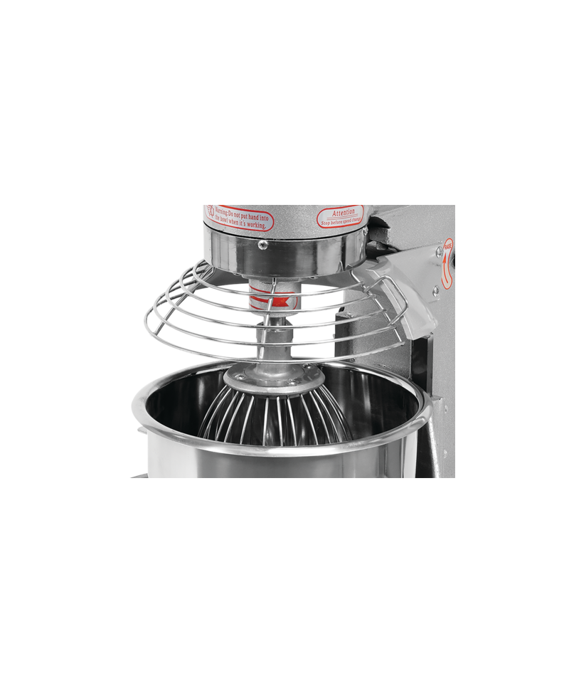 Die geräumige Rührschüssel mit einem Fassungsvermögen von 20 Litern und einem Innendurchmesser von 320mm lässt sich bequem mit einem Hebel absenken, was die Demontage, Entleerung und Reinigung erleichtert. Der Mischer ist mit fortschrittlichen Sicherheitssystemen ausgestattet: einer Verriegelung, die das Starten bei abgesenkter Rührschüssel verhindert, und einer automatischen Abschaltung, falls versucht wird, die Schutzabdeckung während des Betriebs zu öffnen.