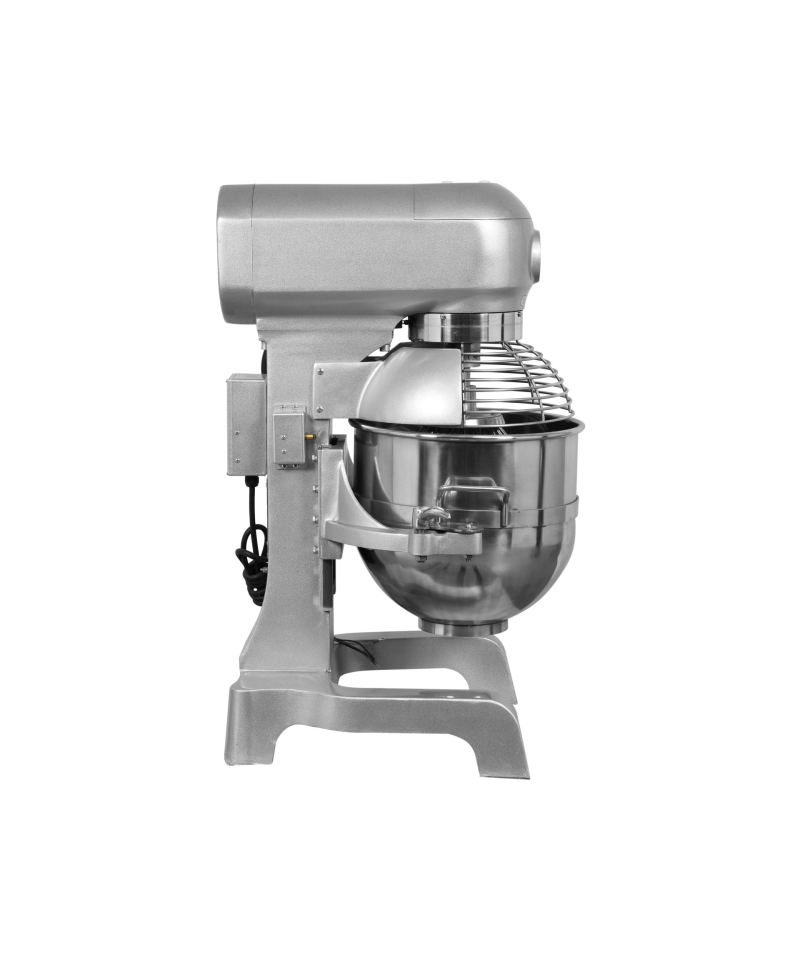 Die robuste Konstruktion des Mixers mit Abmessungen von 990x640x520mm und einem Gewicht von 152kg garantiert Stabilität und Langlebigkeit. Das Gehäuse, gefertigt aus hochwertigem Aluminium und Stahl, in einem eleganten silbermetallicfarbenen Finish, ist nicht nur ästhetisch, sondern auch äußerst leicht hygienisch sauber zu halten. Entscheidend für die Gastronomie ist, dass die Rührschüssel und alle zusätzlichen Zubehörteile aus hochwertigem Edelstahl gefertigt sind, der vollständig lebensmittelecht ist.