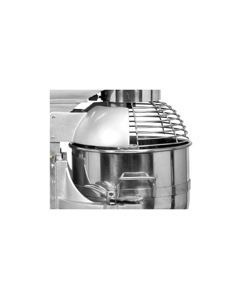 Die geräumige Rührschüssel mit einem Volumen von 35 Litern und einem Innendurchmesser von 375mm lässt sich mittels eines ergonomischen Hebels leicht absenken, was ihre Demontage, Entleerung und gründliche Reinigung erheblich erleichtert. Für maximale Sicherheit ist der Mixer mit fortschrittlichen Schutzmechanismen ausgestattet: Er startet nicht, wenn die Rührschüssel abgesenkt ist, und schaltet sich automatisch ab, falls versucht wird, die Schutzabdeckung während des Betriebs zu öffnen.