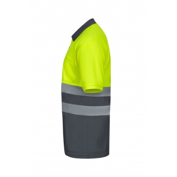 Zweifarbiges Warnpolo aus atmungsaktivem Bird-Eye-Polyester. Mit reflektierenden Streifen, Kontrastkragen und Brusttasche. Zertifiziert nach EN 20471 Klasse 1.