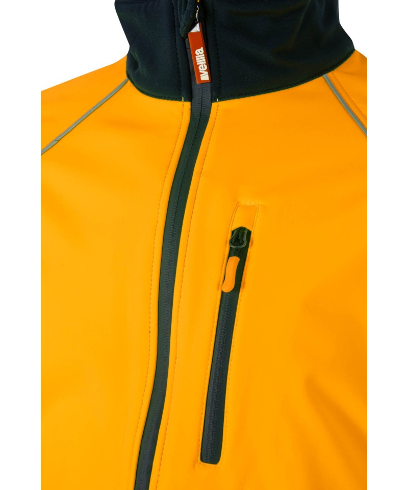 Dreilagige Softshelljacke mit Fleecefutter, wasserdichtem Reißverschluss und Reflexstreifen. Fünf Taschen, verstellbare Passform, EN 20471 Klasse 2 zertifiziert