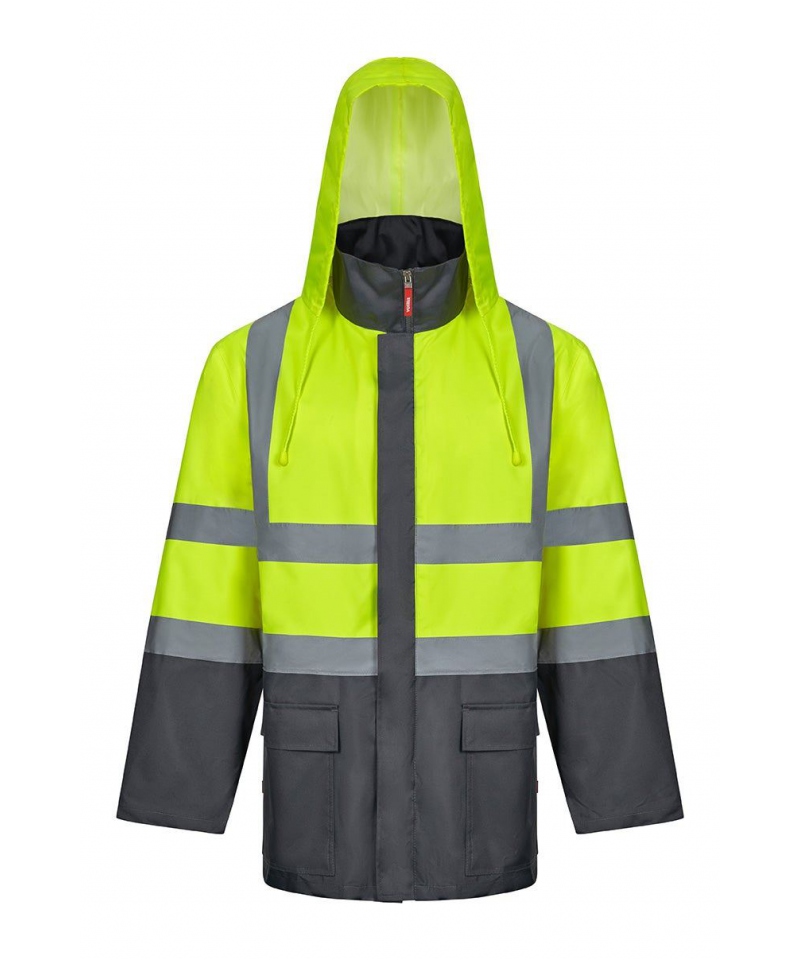 Die zweifarbige 4-in-1-Parka ist ein multifunktionales Kleidungsstück für den professionellen Einsatz in anspruchsvollen Wetterverhältnissen. Diese Arbeitsjacke vereint vier Funktionen in einem: Regenmantel, gefütterte Jacke, Softshell-Schicht und Warnweste.