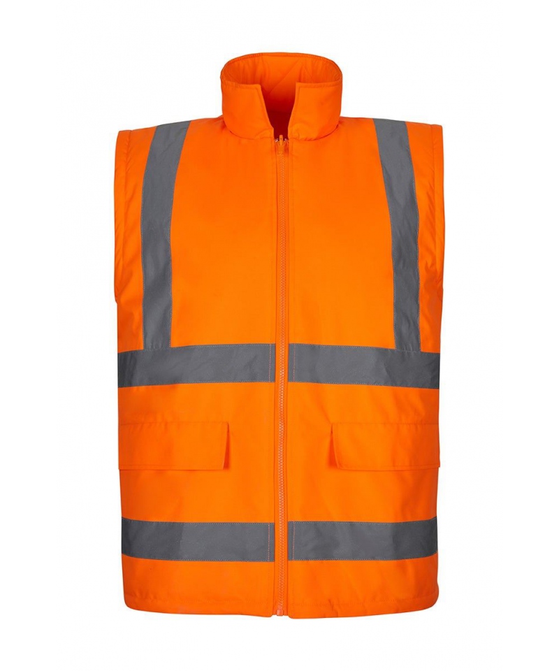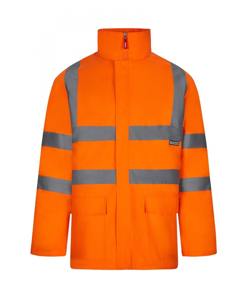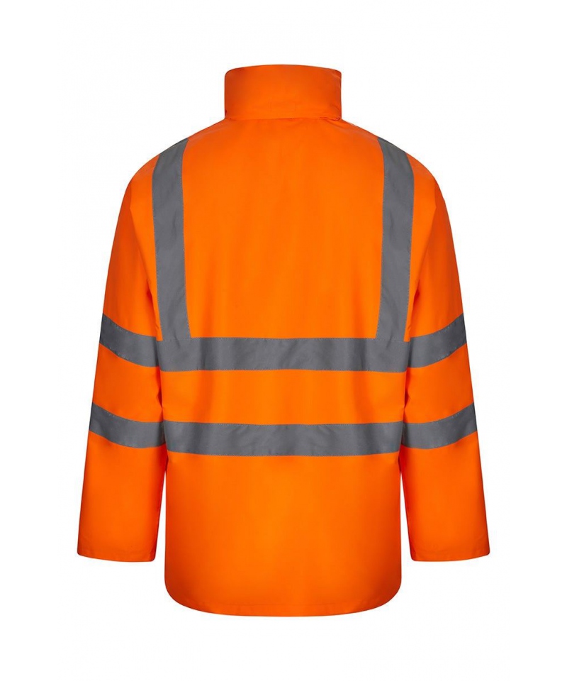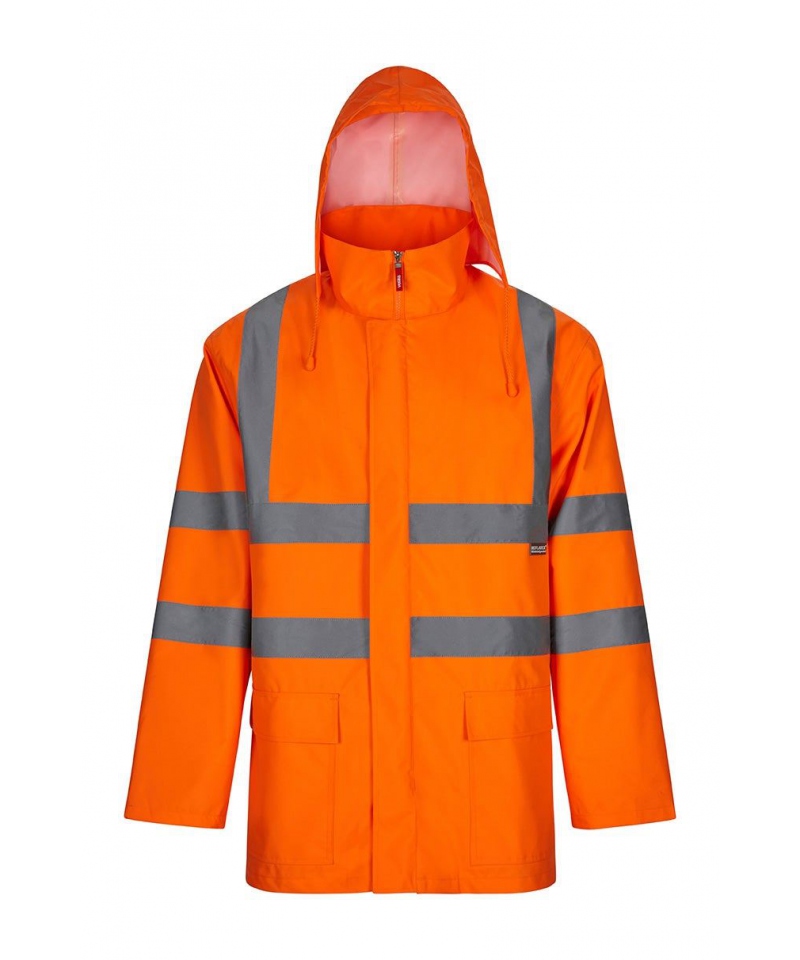 Reflektierende Streifen gemäß EN 20471 Klasse 3 befinden sich auf dem Oberkörper, den Schultern und den Ärmeln – für maximale Sichtbarkeit bei Tag und Nacht. Der durchgehende Frontreißverschluss wird von einer Patte mit Klettverschluss abgedeckt, um optimalen Schutz vor Wind und Regen zu bieten. Im Kragen ist eine Kapuze integriert, die bei Bedarf herausgezogen werden kann. Elastische Strickbündchen sorgen für guten Sitz und zusätzlichen Komfort.