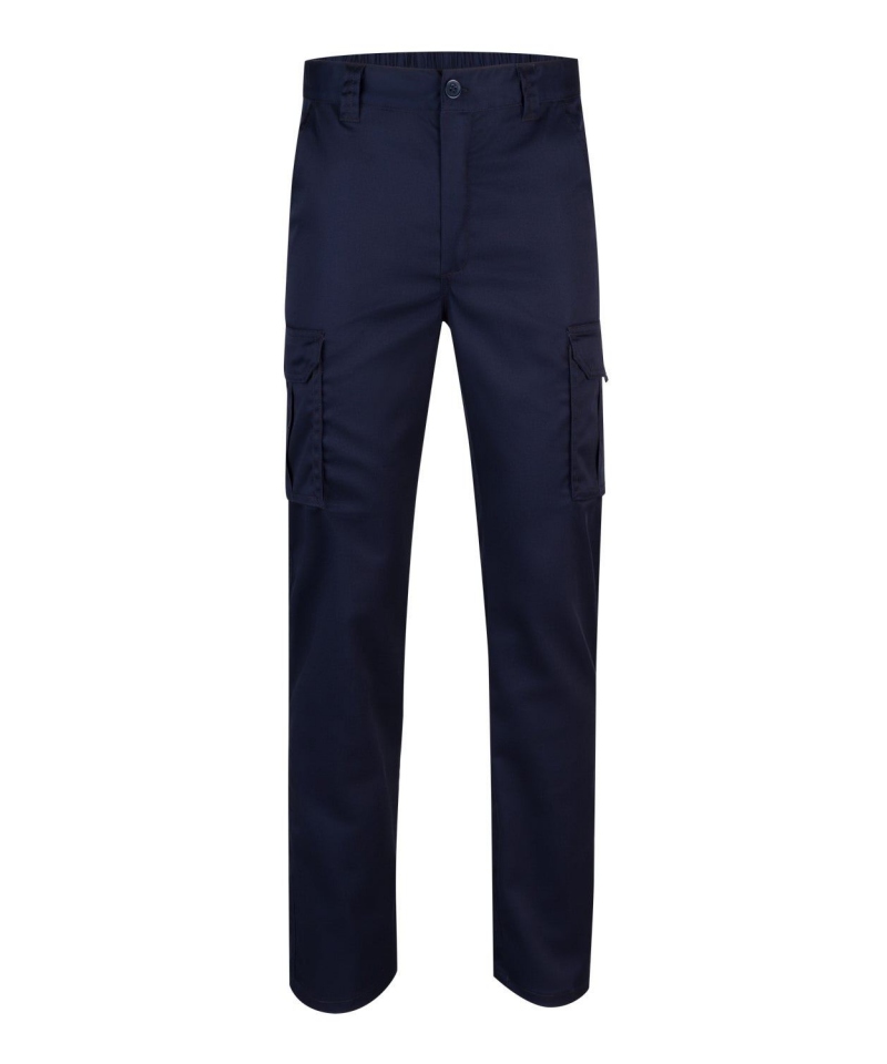 Der zentrale Reißverschluss mit Knopfverschluss bietet sicheren Halt, während der elastische Bund für optimale Anpassung sorgt. Doppelte Sicherheitsnähte erhöhen die Lebensdauer, und kontrastierende Nähte verleihen der Hose einen sportlichen Look. Insgesamt sechs funktionale Taschen – darunter zwei französische Fronttaschen, zwei aufgesetzte Cargotaschen mit Balgfalten, Klappen, Klettverschlüssen und Zughilfen sowie zwei Gesäßtaschen mit Klappen und Klett – bieten ausreichend Platz für Werkzeuge und Zubehör.