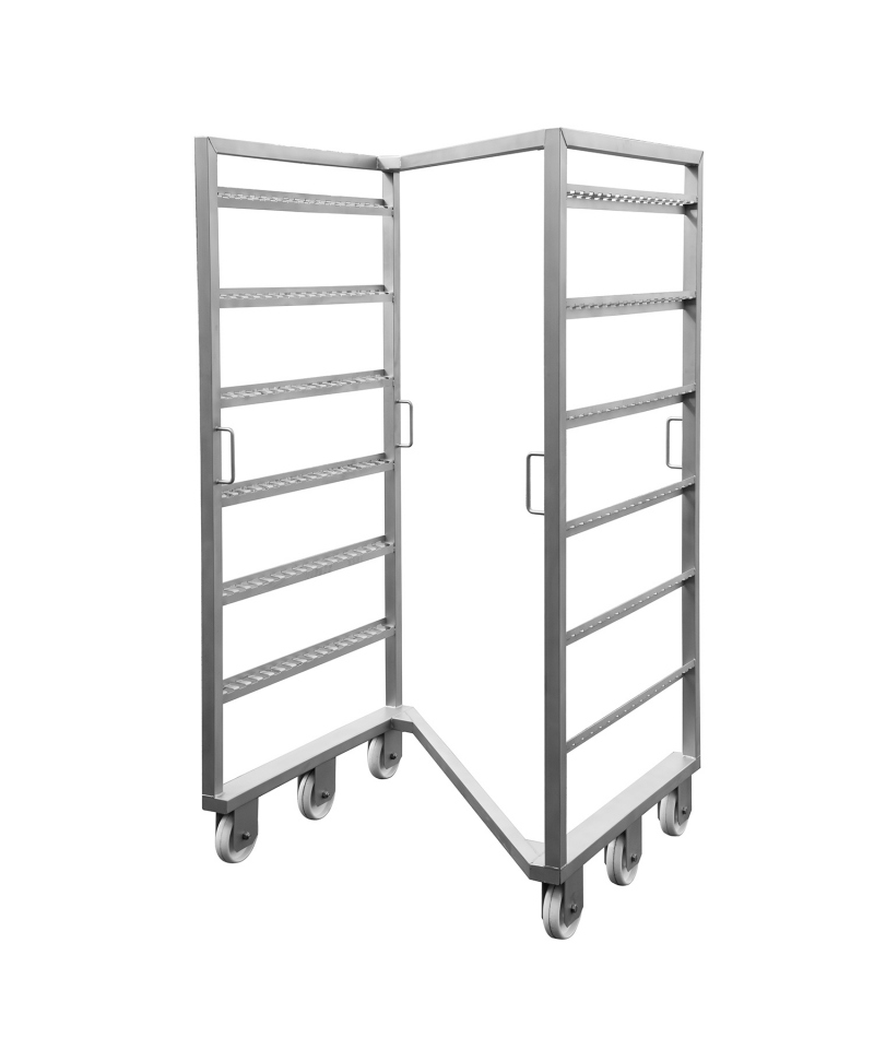 Wagen, der beim Räuchern von Würsten und Schinken verwendet wird. Komplett aus Edelstahl gefertigt und mit 6 Rollen ausgestattet. Der Wagen verfügt über 6 Ebenen für Räucherstäbe mit einer Länge von 985 mm.