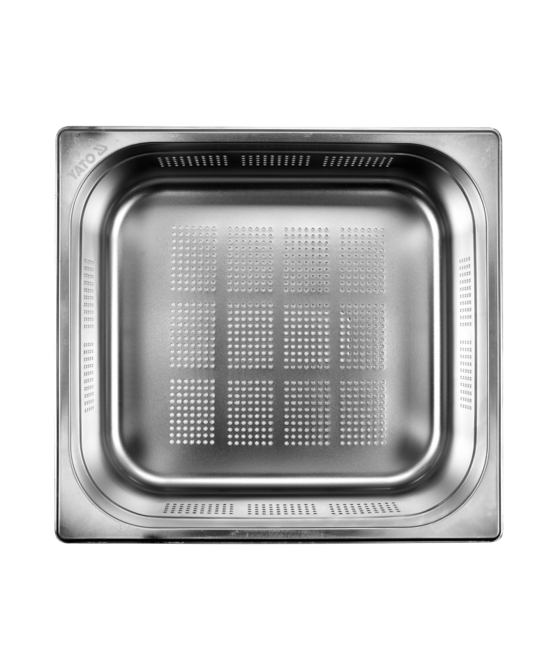 Wir präsentieren einen professionellen perforierten GN-Behälter der Marke YATO, hergestellt aus hochwertigem Edelstahl. Mit Standardmaßen von **GN 2/3** und einer Tiefe von **100 mm** bietet er ein Fassungsvermögen von **8,0 l**. Die Gastronorm-Behälter aus der Linie **YATO Professional Kitchen Equipment** wurden für den **intensiven, professionellen Einsatz** in der Gastronomie und in Großküchen entwickelt. Hergestellt aus **hochwertigem Edelstahl Typ 201**, der sich durch eine matte, glatte Oberfläche auszeichnet, erfüllen sie die strengen Normen der **GASTRO NORM PN-EN 631-1:1996**. Ihre Vielseitigkeit ermöglicht eine sichere Lagerung von Lebensmitteln in einem weiten Temperaturbereich: vom Tiefkühlen bis **-40°C** bis hin zu Anwendungen, die hohe Temperaturen erfordern, bis zu **300°C**. Dadurch sind sie ideal für den Einsatz in **Kombidämpfern**. Sie zeichnen sich durch **außergewöhnliche Beständigkeit** gegen mechanische Beschädigungen, organische Säuren und aggressive Reinigungsmittel aus. Diese Eigenschaft macht sie **hervorragend für die Reinigung in Geschirrspülmaschinen** und widerstandsfähig gegenüber intensiver Reinigung, wobei sie ein makelloses Aussehen behalten. Die Liebe zum Detail zeigt sich in den **abgerundeten Ecken und glatten Kanten**, was das **höchste Maß an Sicherheit und Hygiene** im täglichen Betrieb gewährleistet. Eine **spezielle Prägung am Umfang** jedes Behälters verstärkt seine Konstruktion erheblich, schützt vor Verformungen bei intensivem Gebrauch und erleichtert die **sichere Stapellagerung**.